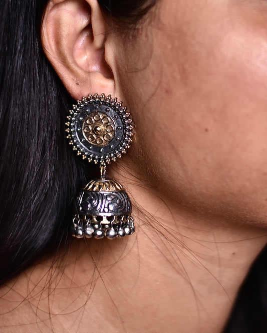 Antique Jhumka Earrings with Floral Motif and Colorful Beads